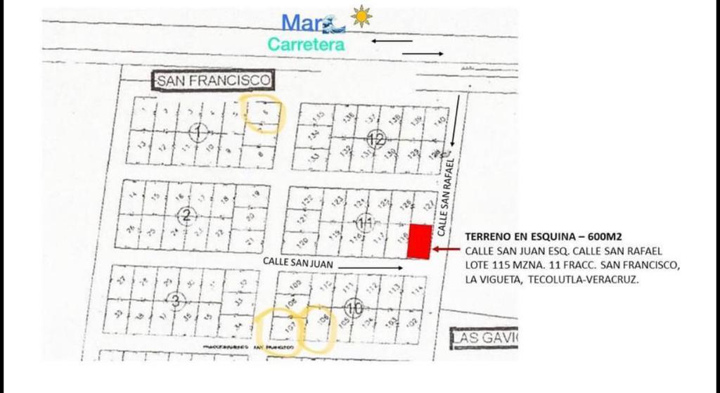 - Calle y Número: CALLE SAN JUAN ESQ. CALLE SAN RAFAEL LOTE 115 MZNA. 11 FRACC. SAN FRANCISCO, LA VIGUETA, TECOLUTLA-VERACRUZ.