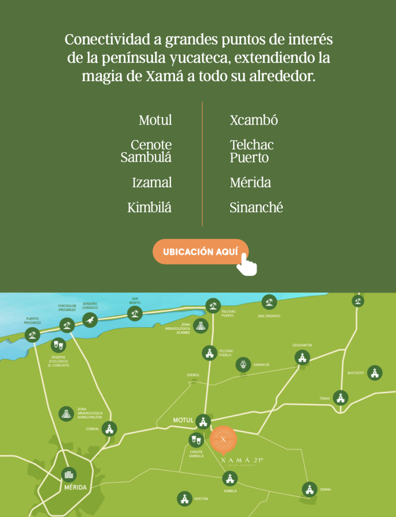 A tan solo 20 minutos de la playa Telchac Puerto – 5 minutos del municipio de Motul – 30 minutos de la blanca Mérida. Donde podrás encontrar todos los servicios como bancos, hospitales, farmacias, supermercados, etc.